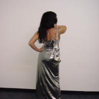 Gezielt setzt sie ihre erotischen Reize bei verschiedenen Posen ein. In dem silbernen Kleid hat das verruchte Luder eine unglaublich sexy Figur. mehr Bilder >>